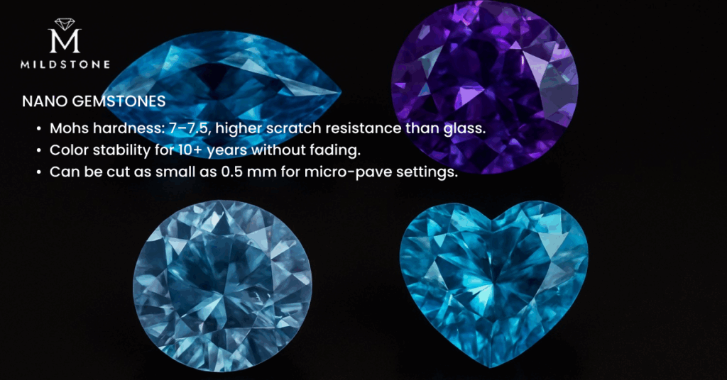 Nano gemstones offer vivid, uniform colors and exceptional clarity thanks to their advanced laboratory creation. They are highly durable and resistant to fading, ensuring lasting brilliance over time. With their eco-friendly production and precision quality, they deliver luxury aesthetics at an accessible price.