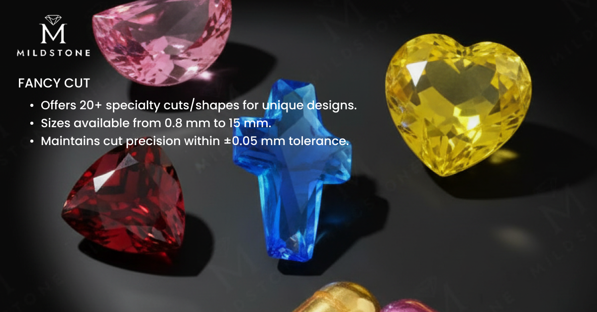 Fancy cut gemstones feature unique shapes like pear, oval, heart, or marquise that enhance brilliance and individuality, designed to maximize light reflection for exceptional sparkle and character, while adding a touch of modern elegance and distinct personality to any jewelry design.